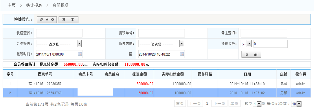 3.會(huì)員提現(xiàn)統(tǒng)計(jì):將統(tǒng)計(jì)在滿足設(shè)定的條件下的所有提現(xiàn)的概況