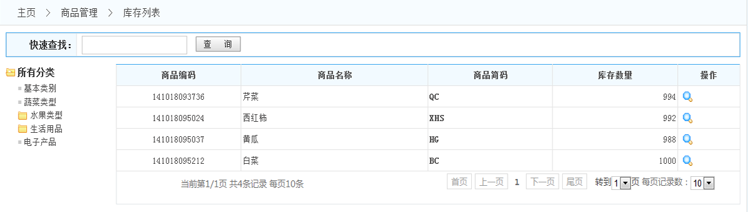 庫存列表: 1.快速查找:根據(jù)商品的編碼或者簡碼或者名稱,快速的查找出指定的商品 2.類型列表:列出所有的商品分類 點(diǎn)擊分類名稱 商品列表中會(huì)顯示這個(gè)分類的所有商品 3.商品列表:列出所有的普通商品 在列表的操作一欄可以查看異店庫存 如下圖