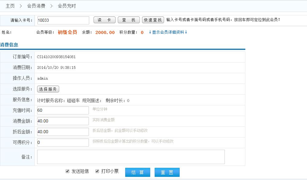 點擊選擇服務(wù)按鈕,選擇會員充時的計時服務(wù),然后輸入充時的時間,系統(tǒng)將自動通過選擇的服務(wù)的規(guī)則計算出消費金額、可得積分等數(shù)據(jù)并自動填充