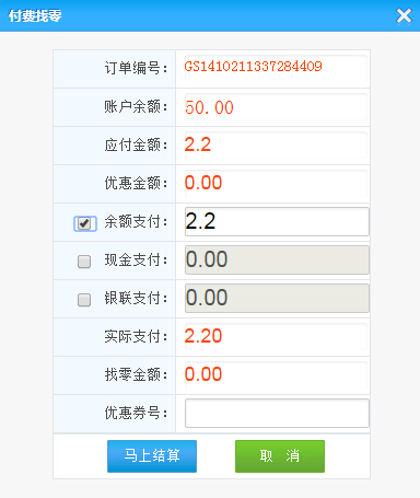 點擊結(jié)算圖標,將彈出付費找零對話框,點擊馬上結(jié)算可完成此掛單消費: